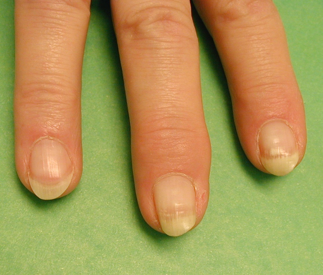 Leukonychia (Figure 6)Leukonychia can be seen with viral infections, intestinal and kidney diseases, poisoning, and medicines. The nail may come loose from the nail bed because of fungal infections or other causes.