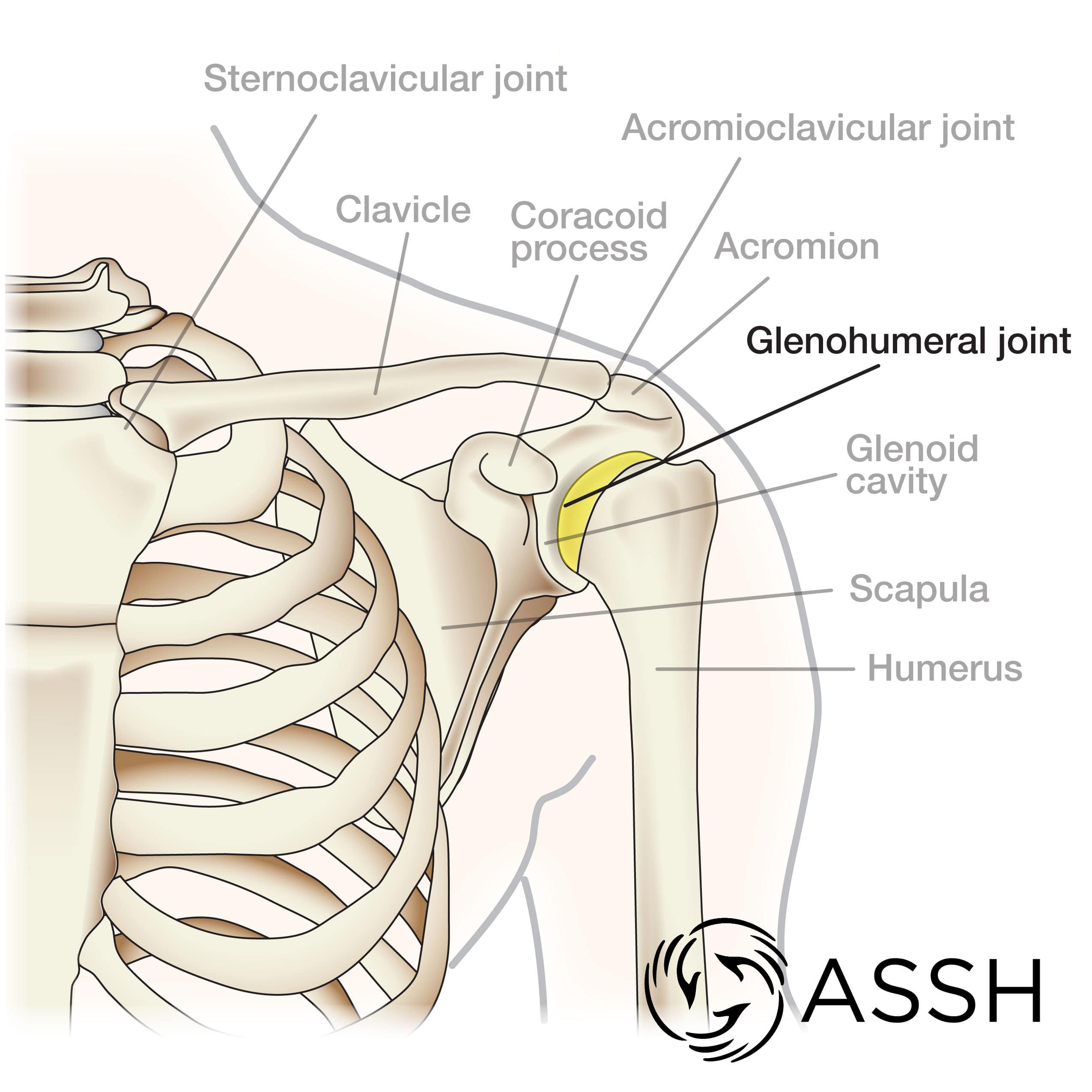 The glenohumeral joint is the coming together of the upper arm bone, the humerus, and a portion of the shoulder blade called the glenoid. The glenoid is a shallow cup that connects to the humerus. The shoulder has a great deal of motion including bending and straightening, moving away from the side of the body, moving toward the body, and circumduction (a spinning type of motion). Common problems with this joint include stiffness, dislocation, labral tears, bursitis, rotator cuff tears, long head of biceps tendonitis or tears, subacromial impingement, proximal humeral fractures, and arthritis.